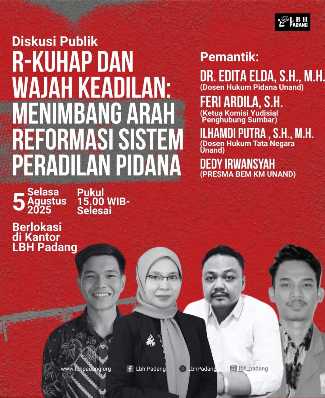 Berkaitan dengan isu itu, Lembaga Bantuan Hukum (LBH) Padang menggelar diskusi publik bertema “RKUHAP dan Wajah Keadilan: Menimbang Arah Reformasi Sistem Peradilan Pidana” yang diselenggarakan pada Selasa (5/8 /2025) di Kantor YLBHI LBH Padang dengan menghadirkan narasumber dan pemantik diskusi antara lain Edita Elda Dosen Hukum Pidana Fakultas Hukum Universitas Andalas, Fery Ardila, Koordinator Kantor Penghubung Komisi Yudisial Sumatera Barat, Ilhamdi Putra, Dosen Hukum Tata Negara Fakultas Hukum Unand dan Dedy Irwansyah, Presiden Mahasiswa Badan Eksekutif Mahasiswa (BEM) Unand.